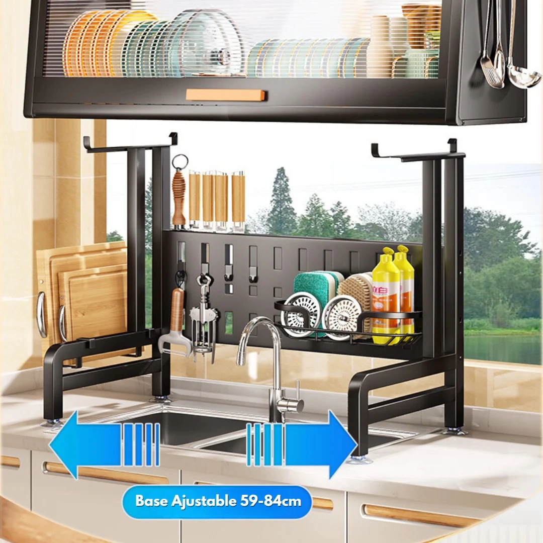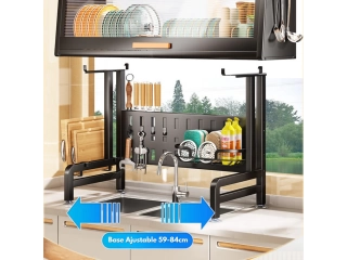 Ahorro de espacio en la cocina todo en uno: aprovecha eficientemente el espacio sobre el fregadero para almacenar utensilios de cocina, sin ocupar espacio en la encimera. Además, es a prueba de polvo y garantiza la limpieza de los platos. Viene equipado con un soporte para cuchillos, una jaula para palillos, un soporte para tabla de cortar, una cesta de limpieza y ganchos.