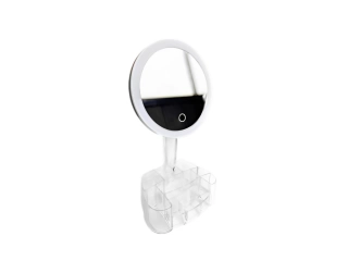 Montante y pie de acrílico transparente. El pie posee reparticiones para la colocación de las herramientas de maquillaje y/o accesorios como caravanas y anillos