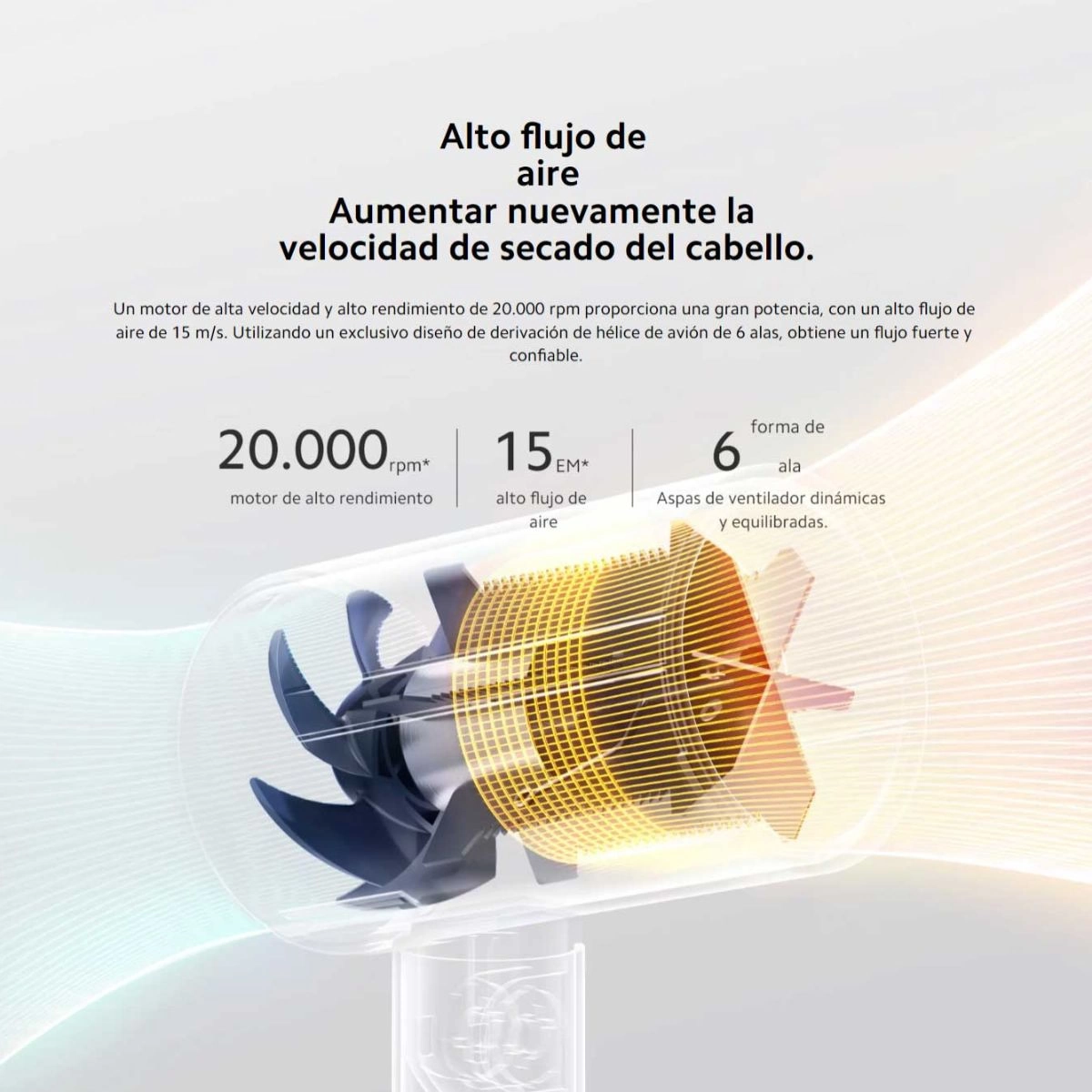 Un motor de alta velocidad y alto rendimiento de 20.000 rpm proporciona una gran potencia, con un alto flujo de aire de 15 m/s. Utilizando un exclusivo diseño de derivación de hélice de avión de 6 alas, obtiene un flujo fuerte y confiable.