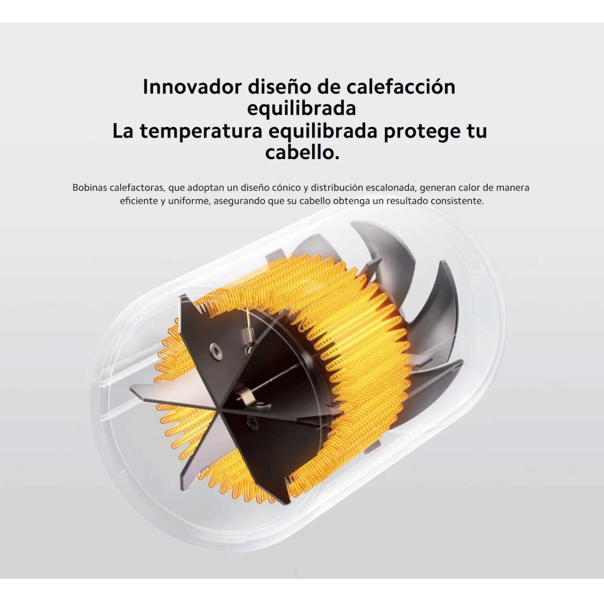 Bobinas calefactoras, que adoptan un diseño cónico y distribución escalonada, generan calor de manera eficiente y uniforme, asegurando que su cabello obtenga un resultado consistente.